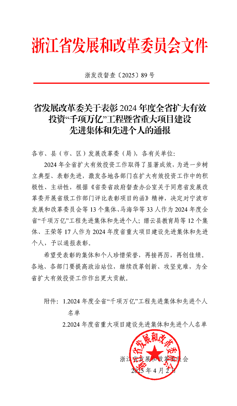 2025年4月2日,浙江省發展改革委發布關于表彰2024 年度全省擴大有效投資“千項萬億”工程暨省重大項目建設先進集體和先進個人的通報文件,王榮董事長獲評2024年度浙江省重大項目建設先進個人。