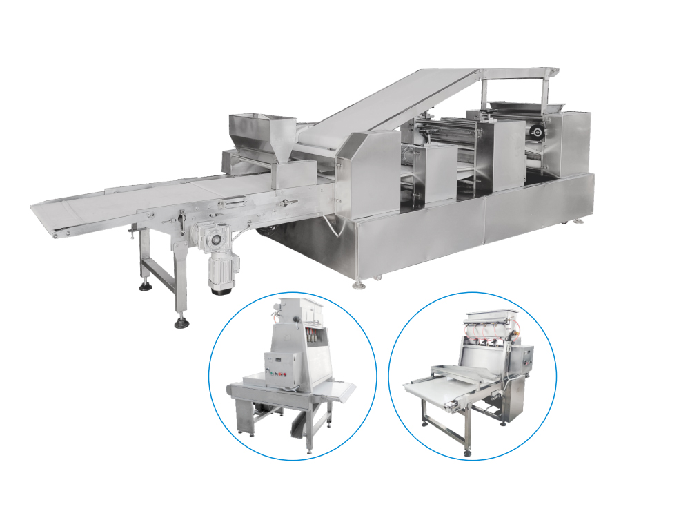 型號(hào)  型號(hào)500/600/700型  生產(chǎn)流程  拌漿機(jī)將糖漿加熱攪拌均勻→和面→面團(tuán)擠出輸送→面餅成型→一次烘烤→噴糖→二次烘烤→冷卻  特色  1、成型機(jī)為變頻調(diào)速,自動(dòng)化程度高,更換模具可生產(chǎn)多規(guī)格產(chǎn)品?! ?、電烤爐通過(guò)加熱管加熱,并進(jìn)行了合理的爐溫分區(qū),節(jié)能環(huán)保的同時(shí)還具有升溫快,降溫少,補(bǔ)溫快等特點(diǎn)。  3、整套設(shè)備自動(dòng)化程度高、操作簡(jiǎn)單方便,可生產(chǎn)出多品種、多規(guī)格的產(chǎn)品。減輕勞動(dòng)力,節(jié)省人工成本出品穩(wěn)定,輕松實(shí)現(xiàn)量產(chǎn)化?! ?、機(jī)器安全、防護(hù)、可靠、穩(wěn)定性高。電氣安全符合國(guó)家標(biāo)準(zhǔn)。  5、可以根據(jù)客戶場(chǎng)地及工藝要求進(jìn)行定制?! ‰娍緺t技術(shù)參數(shù)
